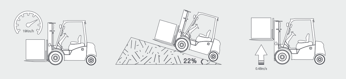 - Lowering speed (laden/ unladen): 0.43/0.44m/s